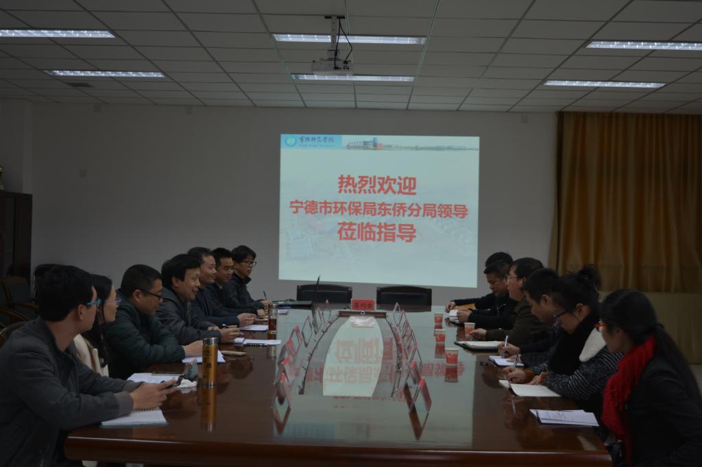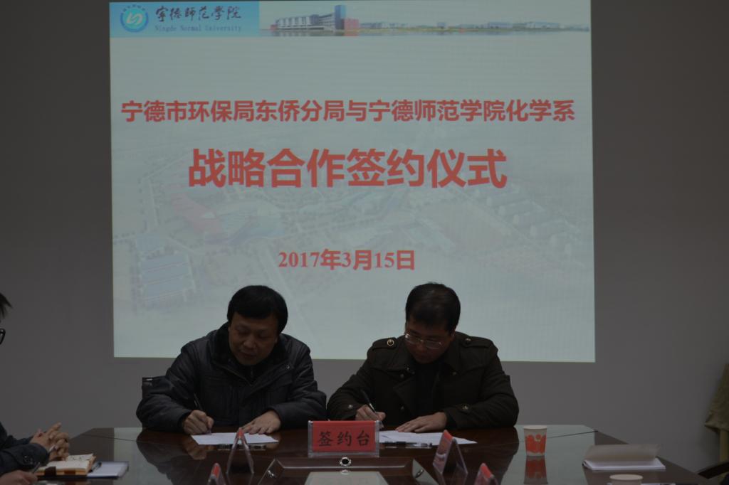 2017年3月15日下午,宁德市环保局东侨分局局长杨明武、副局长刘招椿带领有关人员莅临化学系指导工作并和我系签订战略合作协议。化学系颜桂炀主任、应少明副主任等相关人员出席。签约仪式由颜主任主持。